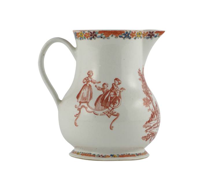 Bow jug, transfer-printed in brick red with European imagery – scenes from Hubert Gravelot's "Youthful Diversions". c.1755. 12.5cm high. Value: £7,000-£8,000