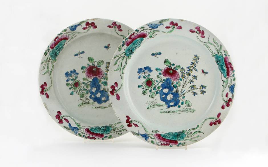 Pair of Bow plates, polychrome painted with Oriental style floral and rockwork decoration. c.1758-60. 33.25cm diam. Value: £800-£1,000