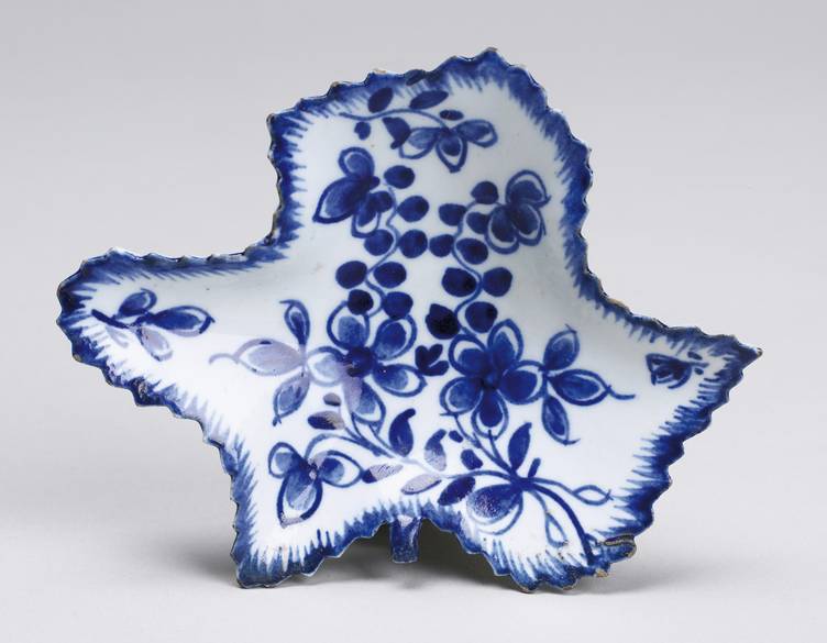 A Bow leaf dish painted in an Oriental style in under-glaze blue. c.1750. 10cm wide. Value: £500-700.